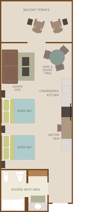 Nuestras habitaciones Double Queen, con vistas al río o a la piscina, cuentan con dos confortables camas de tamaño Queen, un acogedor salón y una cocina pequeña perfecta para preparar desayunos ligeros, comidas y tentempiés para las excursiones. Le gustarán sus influencias de diseño: madera recuperada, tejidos naturales y un ventanal que refleja la belleza del cañón y le hace sentir como si estuviera en el exterior.